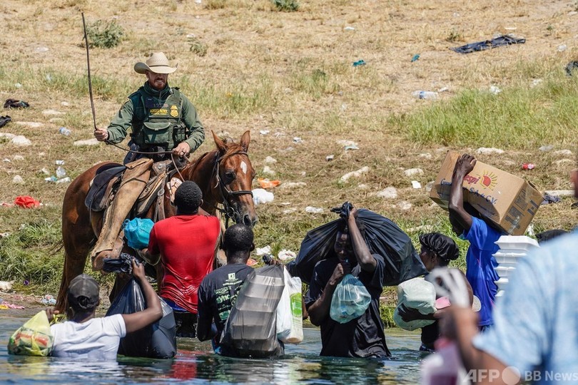 AFPのポール・レイチ(Paul Ratje)カメラマンが19日、テキサス州デルリオ(Del Rio)で撮影した一連の写真には、国境警備隊が馬の長い手綱を振って不法移民を威嚇し、国境を流れるリオグランデ(Rio Grande)川に押し戻しているように見える場面が写っている。
