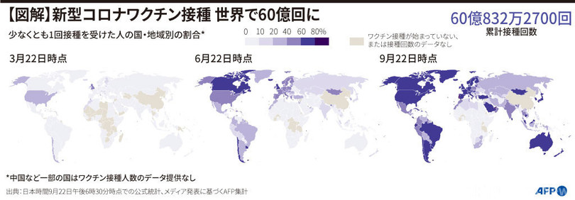 ニュース ライフ 図解 特集:新型コロナウイルス感染症「COVID-19」 【図解】新型コロナワクチン接種 世界で60億回に 2021年9月23日 17:04 発信地:武漢/中国 [ 中国 中国・台湾 ] このニュースをシェア ‹ › ❮ 1/4 ❯ 国・地域別の新型コロナウイルスワクチン接種率の推移(2021年9月22日作成)。(c)SOPHIE RAMIS, CLEA PECULIER / AFP 画像作成中 ! 【9月23日 AFP】新型コロナウイルスワクチンの世界の接種回数が22日、AFPの集計で累計60億回に達した。3か月ごとの国・地域別の接種率を図に示した。(c)AFP 特集:新型コロナウイルス感染症「COVID-19」 世界各地で猛威を振るう新型コロナウイルス。 ライフ 一覧へ> メディア・報道関係・法人の方向け 写真・動画 購入のお問合せ>
