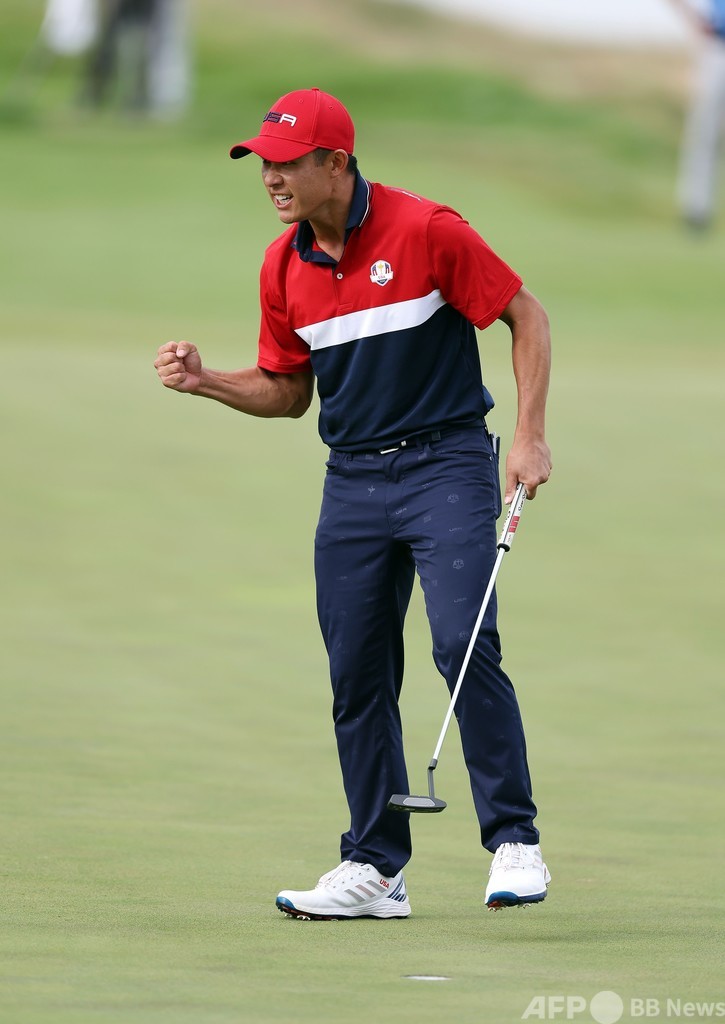 チーム最年長の37歳として臨み、若いチームメートに手本を示した世界2位のダスティン・ジョンソン(Dustin Johnson)はこの日、ポール・ケーシー(Paul Casey、英国)との接戦に1アップで勝利。米国選抜では1979年大会のラリー・ネルソン(Larry Nelson)以来となる5戦全勝をマークした。(c)AFP/Rebecca BRYAN