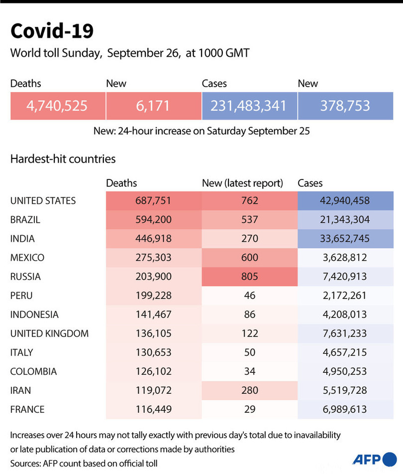 【9月27日 AFP】AFPが各国当局の発表に基づき日本時間26日午後7時にまとめた統計によると、世界の新型コロナウイルスによる死者数は474万525人に増加した。