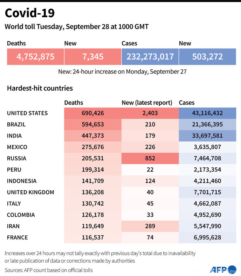 【9月28日 AFP】AFPが各国当局の発表に基づき日本時間28日午後7時にまとめた統計によると、世界の新型コロナウイルスによる死者数は475万2875人に増加した。