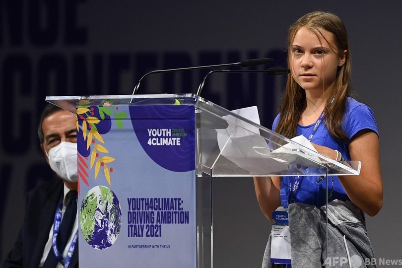 11月の気候変動枠組み条約第26回締約国会議(COP26)を前にイタリア北部ミラノ(Milan)で開催されたイベント「ユース・フォー・クライメート(Youth4Climate)」で演説したトゥンベリさんは、各国政府が十分な温室効果ガス削減と資金提供の誓約をしていないのにもかかわらず、「恥を知ることなく自画自賛している」と非難。各国首脳の言葉には行動が伴っていないと指摘した。