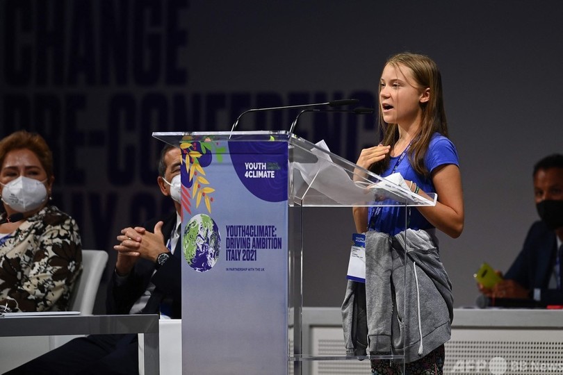 11月の気候変動枠組み条約第26回締約国会議(COP26)を前にイタリア北部ミラノ(Milan)で開催されたイベント「ユース・フォー・クライメート(Youth4Climate)」で演説したトゥンベリさんは、各国政府が十分な温室効果ガス削減と資金提供の誓約をしていないのにもかかわらず、「恥を知ることなく自画自賛している」と非難。各国首脳の言葉には行動が伴っていないと指摘した。