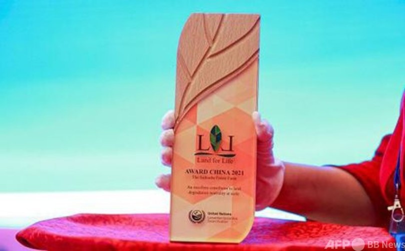「生命の土地賞」は国連砂漠化対処条約(UNCCD)によって設立された砂漠化防止の最高級賞で、砂漠化と土地退化の管理において優れた貢献をし、模範的な役割を果たした個人、集団またはプロジェクトを隔年で表彰し、激励することを目的としています。クブチ国際砂漠フォーラムで河北省塞罕壩機械林場に同賞が授与されました。(c)CGTN Japanese/AFPBB News