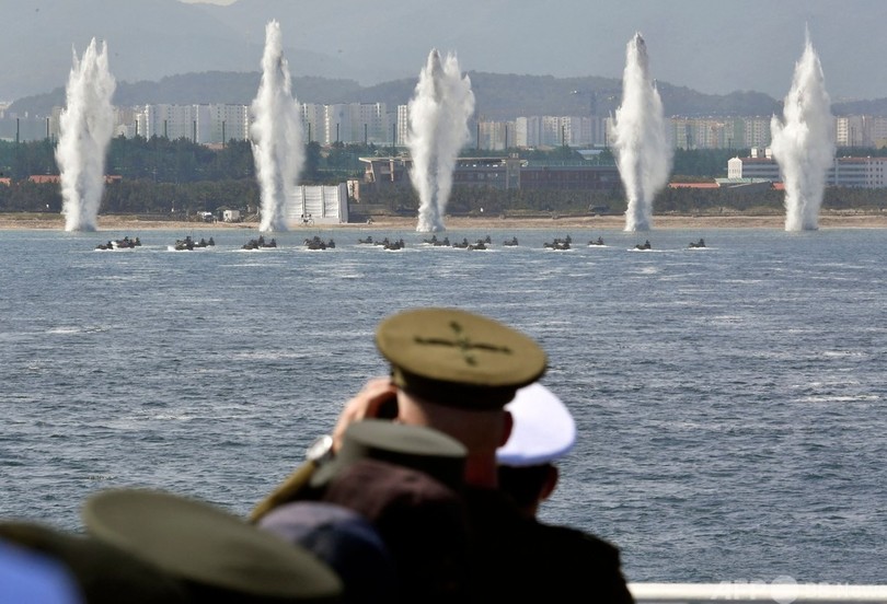 式典には文在寅(ムン・ジェイン、Moon Jae-in)大統領が出席。前日の9月30日には、軍艦や戦闘機、水陸両用車などが参加する訓練の様子が報道陣に公開された。(c)AFP