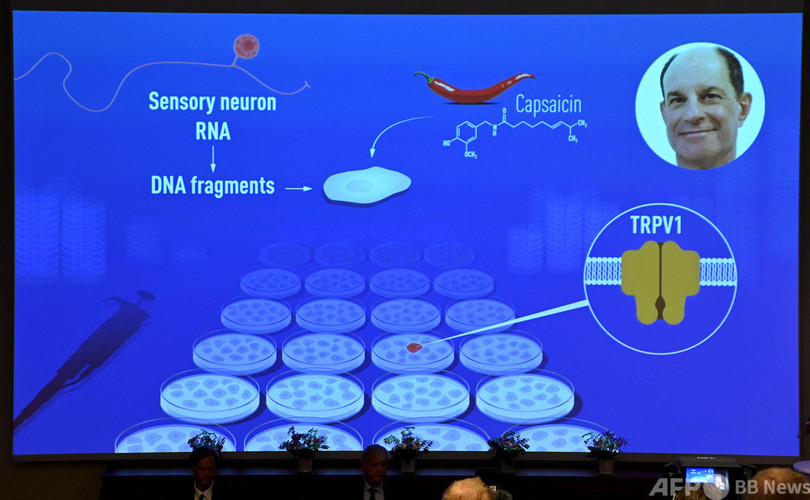 ジュリアス氏は、カリフォルニア州サンフランシスコにあるカリフォルニア大学(University of California)の教授。パタポティアン氏は、同州のスクリプス研究所(Scripps Research Institute)で教授を務めている。両氏は、賞金1000万クローナ(約1億2700万円)を分け合う。(c)AFP