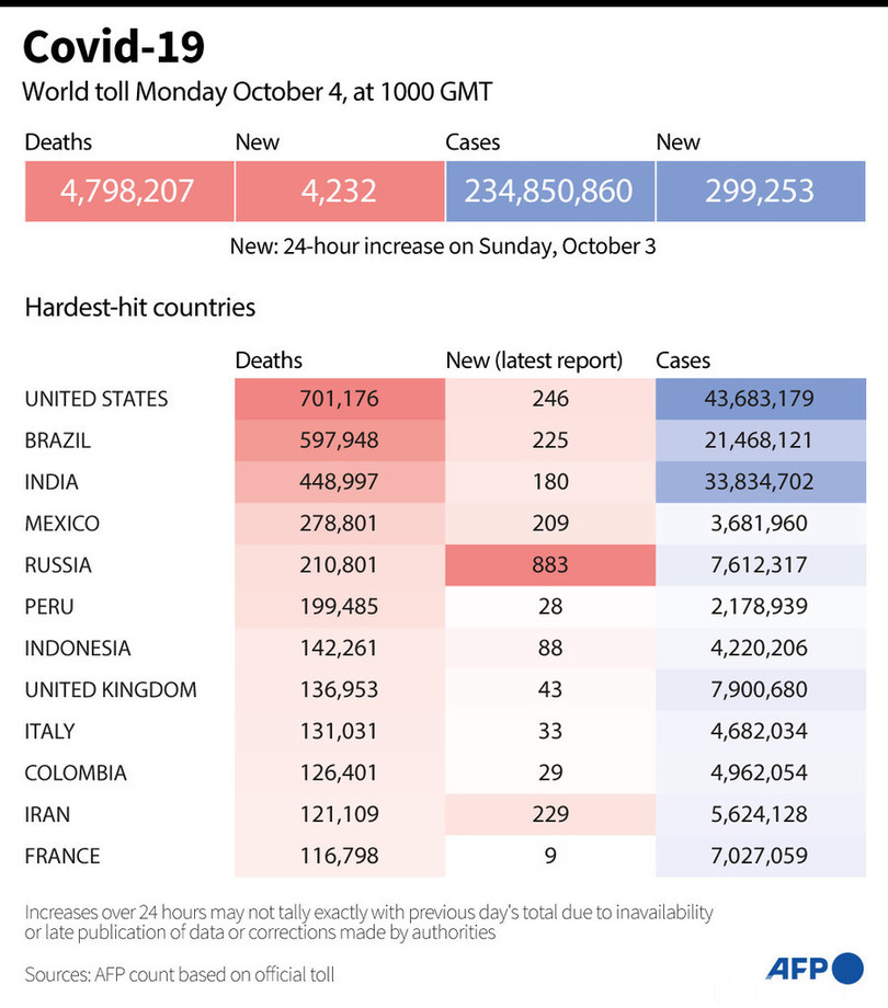 【10月4日 AFP】AFPが各国当局の発表に基づき日本時間4日午後7時にまとめた統計によると、世界の新型コロナウイルスによる死者数は479万8207人に増加した。