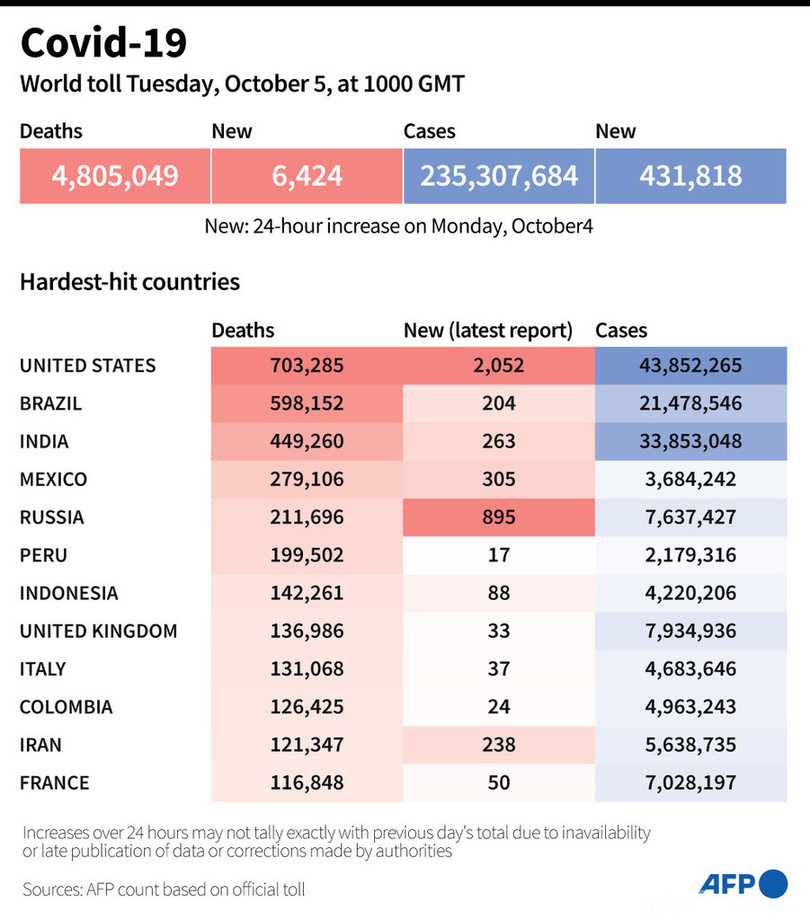 【10月6日 AFP】AFPが各国当局の発表に基づき日本時間5日午後7時にまとめた統計によると、世界の新型コロナウイルスによる死者数は480万5049人に増加した。