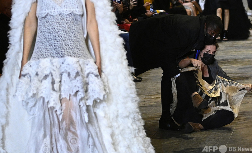 AFPのフォトグラファーによると、活動家の一人は、ルーブル美術館(Louvre Museum)で行われていたショーのさなかにキャットウオークに立ち入り、「過剰消費=絶滅」と書かれた幕を掲げた後、警備員に退出させられた。