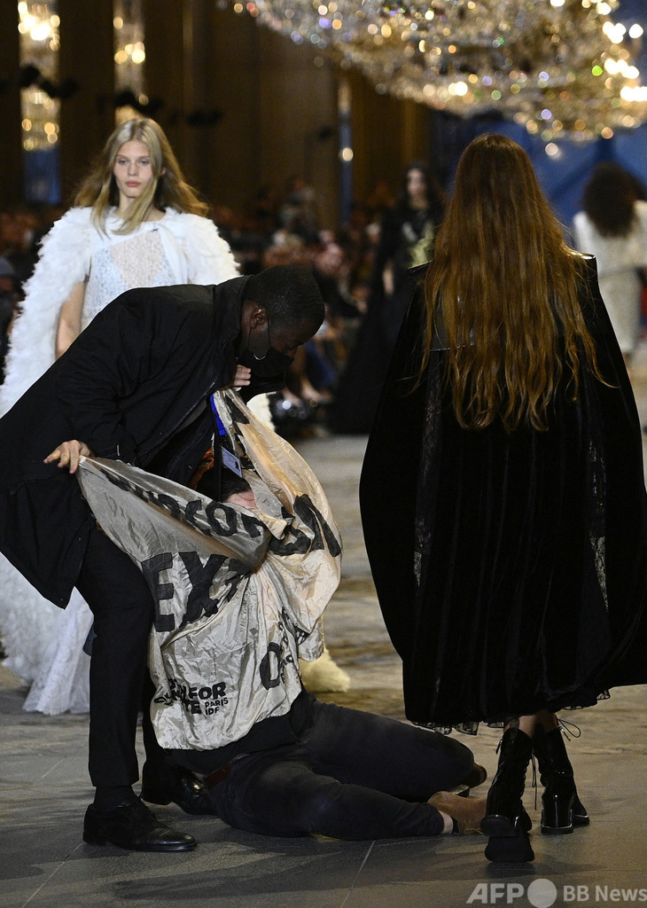 AFPのフォトグラファーによると、活動家の一人は、ルーブル美術館(Louvre Museum)で行われていたショーのさなかにキャットウオークに立ち入り、「過剰消費=絶滅」と書かれた幕を掲げた後、警備員に退出させられた。