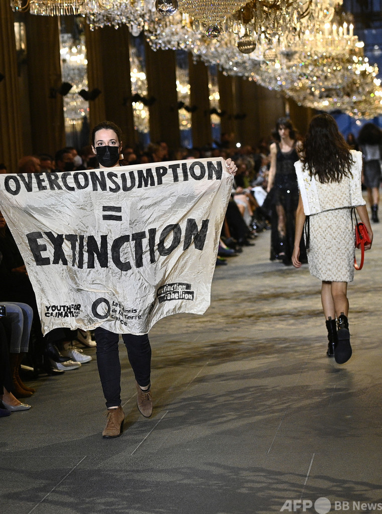 【10月6日 AFP】フランスで開催されているパリ・ファッションウィーク(Paris Fashion Week)で5日に行われたルイ・ヴィトン(Louis Vuitton)のショーに、気候変動の危機を訴える団体「絶滅への反逆(Extinction Rebellion)」の活動家が乱入し、ファッション業界による環境負荷を低減するよう訴えた。