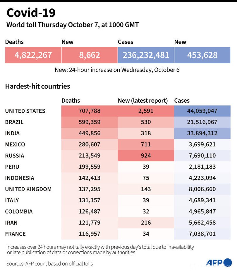 【10月8日 AFP】AFPが各国当局の発表に基づき日本時間7日午後7時にまとめた統計によると、世界の新型コロナウイルスによる死者数は482万2267人に増加した。