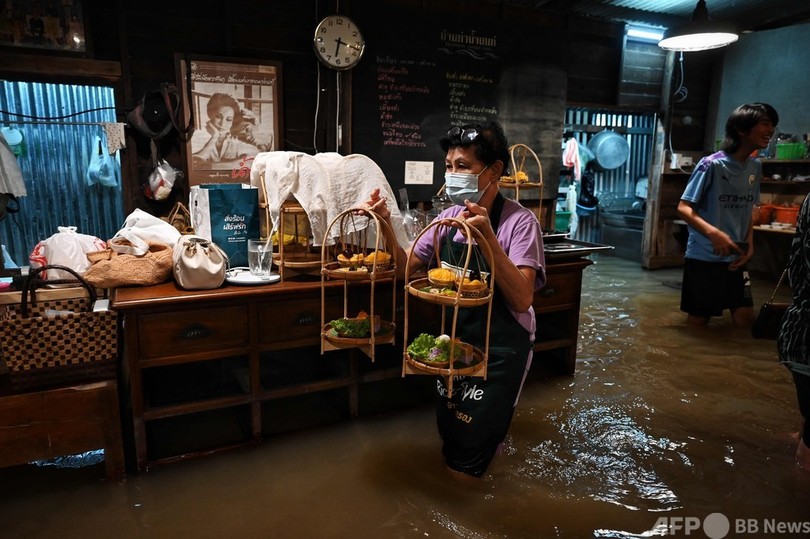 【10月8日 AFP】タイ・ノンタブリ(Nonthaburi)の「チャオプラヤ・アンティークカフェ(Chaopraya Antique Cafe)」は、水辺の景色を楽しむというよりも、水に漬かりながら食事をするレストランだ。テーブルには茶色く濁った水が打ち寄せる。