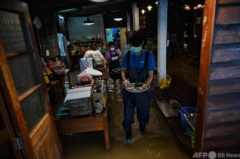 【10月8日 AFP】タイ・ノンタブリ(Nonthaburi)の「チャオプラヤ・アンティークカフェ(Chaopraya Antique Cafe)」は、水辺の景色を楽しむというよりも、水に漬かりながら食事をするレストランだ。テーブルには茶色く濁った水が打ち寄せる。