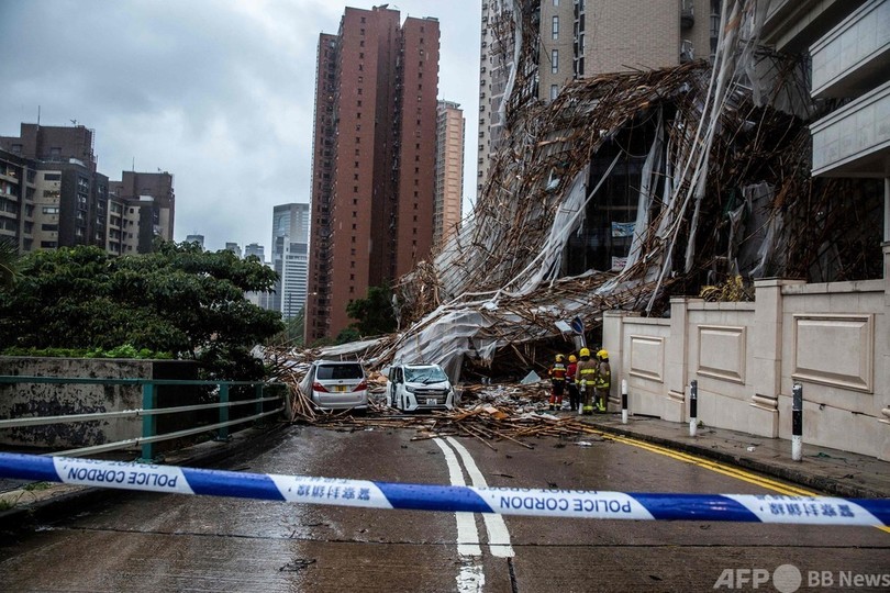 台風17号による豪雨は8日に始まり、住民の多くがその勢力の強さに驚いた。同日朝には、市内の高層マンションを囲んでいた30段の竹の足場が強風にあおられて崩れ道路に落下し、女性1人が死亡した。(c)AFP
