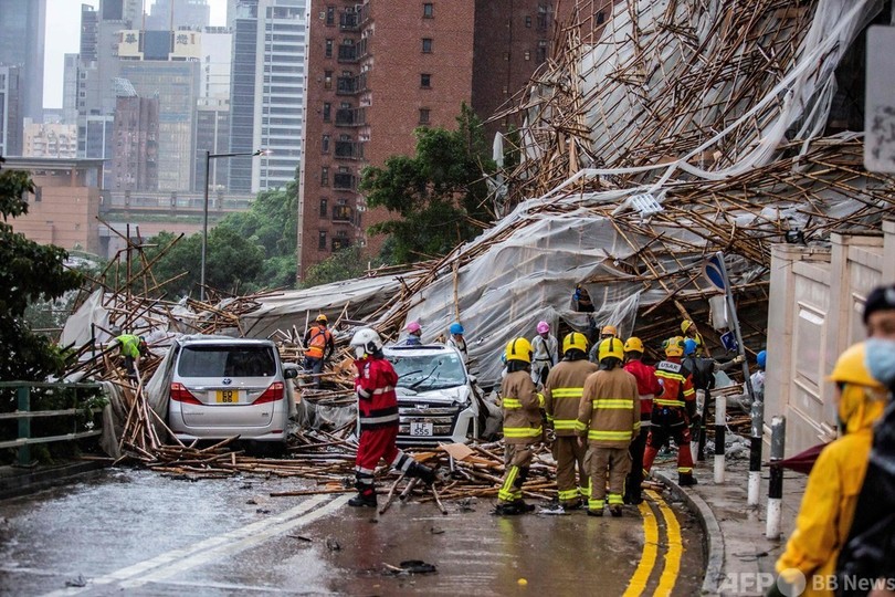 台風17号による豪雨は8日に始まり、住民の多くがその勢力の強さに驚いた。同日朝には、市内の高層マンションを囲んでいた30段の竹の足場が強風にあおられて崩れ道路に落下し、女性1人が死亡した。(c)AFP