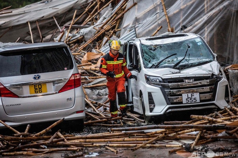 台風17号による豪雨は8日に始まり、住民の多くがその勢力の強さに驚いた。同日朝には、市内の高層マンションを囲んでいた30段の竹の足場が強風にあおられて崩れ道路に落下し、女性1人が死亡した。(c)AFP