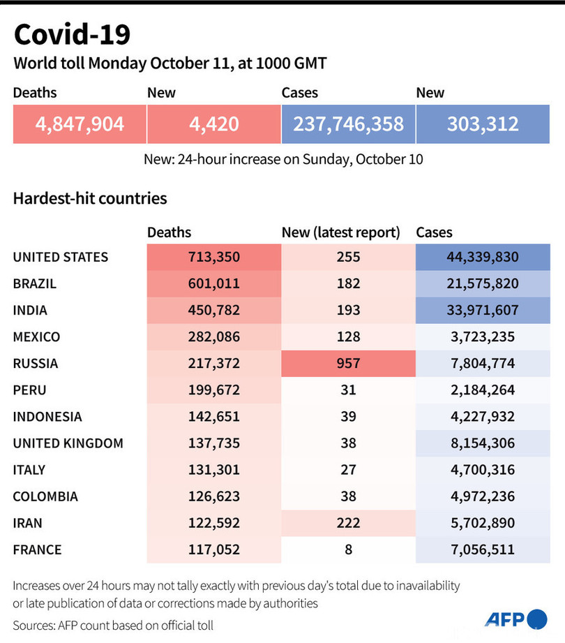 【10月11日 AFP】AFPが各国当局の発表に基づき日本時間11日午後7時にまとめた統計によると、世界の新型コロナウイルスによる死者数は484万7904人に増加した。