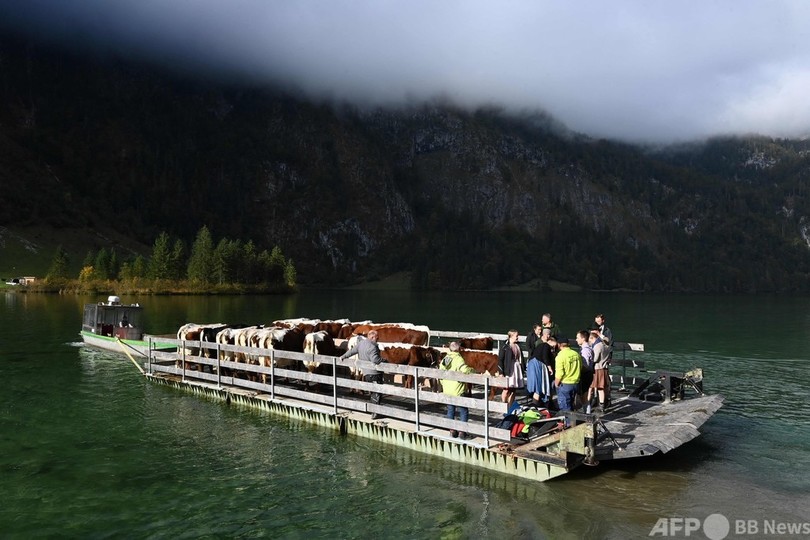 【10月19日 AFP】ドイツ南部、ドイツアルプス(German Alps)地方のシェーナウ(Schoenau)近郊で、ケーニヒス湖(Koenigssee)上を船で移動する農家の人たちと牛。「アルムアプトリープ(Almabtrieb)」と呼ばれるこの伝統行事では、夏を過ごした山の放牧地から谷あいの牛舎へ牛を連れて帰る。(c)AFP