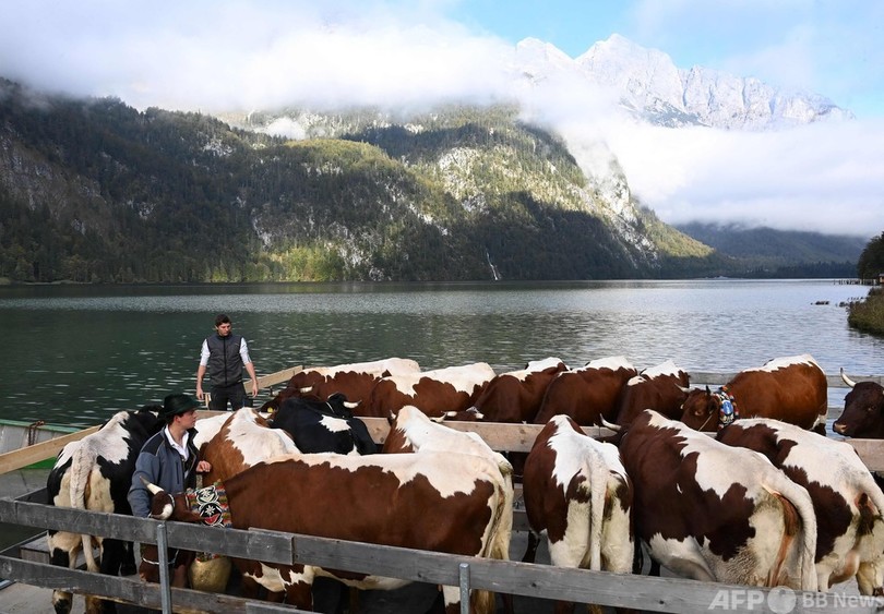 【10月19日 AFP】ドイツ南部、ドイツアルプス(German Alps)地方のシェーナウ(Schoenau)近郊で、ケーニヒス湖(Koenigssee)上を船で移動する農家の人たちと牛。「アルムアプトリープ(Almabtrieb)」と呼ばれるこの伝統行事では、夏を過ごした山の放牧地から谷あいの牛舎へ牛を連れて帰る。(c)AFP