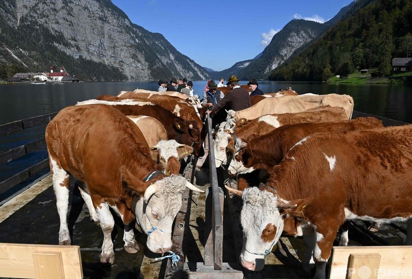 【10月19日 AFP】ドイツ南部、ドイツアルプス(German Alps)地方のシェーナウ(Schoenau)近郊で、ケーニヒス湖(Koenigssee)上を船で移動する農家の人たちと牛。「アルムアプトリープ(Almabtrieb)」と呼ばれるこの伝統行事では、夏を過ごした山の放牧地から谷あいの牛舎へ牛を連れて帰る。(c)AFP