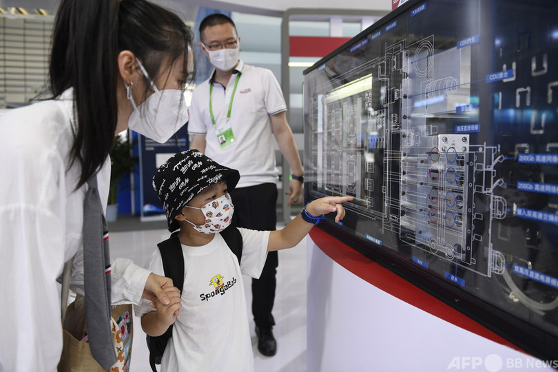ある若者はゴーグルをつけてVR(仮想現実)の世界を体験。コンピューターを丸ごと液体に浸して冷やす「液浸冷却システム」の前では、子どもが不思議そうに見つめていた。文字をなぞってスキャンするとすぐに翻訳する「辞書ペン」を楽しむ親子も。遠方の鉱山にあるショベルカーを第5世代移動通信(5G)技術で遠隔操作する体験コーナーでは、男性たちが真剣な表情で画面を見ながらレバーを操っていた。(c)CNS/JCM/AFPBB News