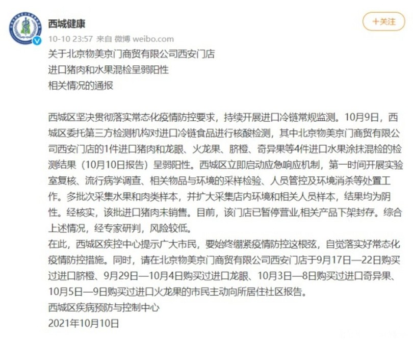 【10月12日 CGTN Japanese】北京市西城区が10日夜に明らかにしたところによりますと、同区が9日、第三者検査機関に委託して輸入冷凍食品に対するPCR検査を行ったところ、「北京物美京門商貿有限公司(西安門店)」の輸入豚肉1点と、リュウガン、ドラゴンフルーツ、ネーブルオレンジ、キウイフルーツの輸入果物4点から弱い陽性反応が出ました。