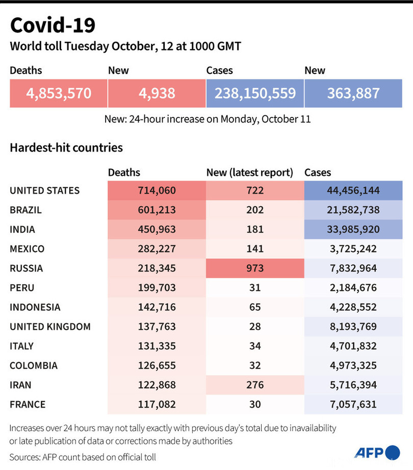 【10月12日 AFP】AFPが各国当局の発表に基づき日本時間12日午後7時にまとめた統計によると、世界の新型コロナウイルスによる死者数は485万3570人に増加した。