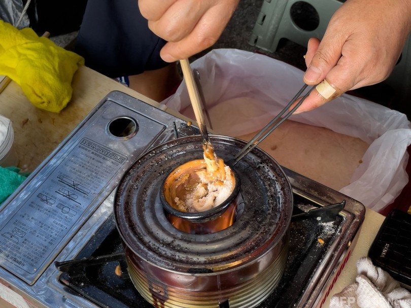 砂糖をバーナーで溶かし、重曹を加え、丸い平たい形にしてから客の選んだ型を押す。イムさんは約90秒で一連の作業を終える。