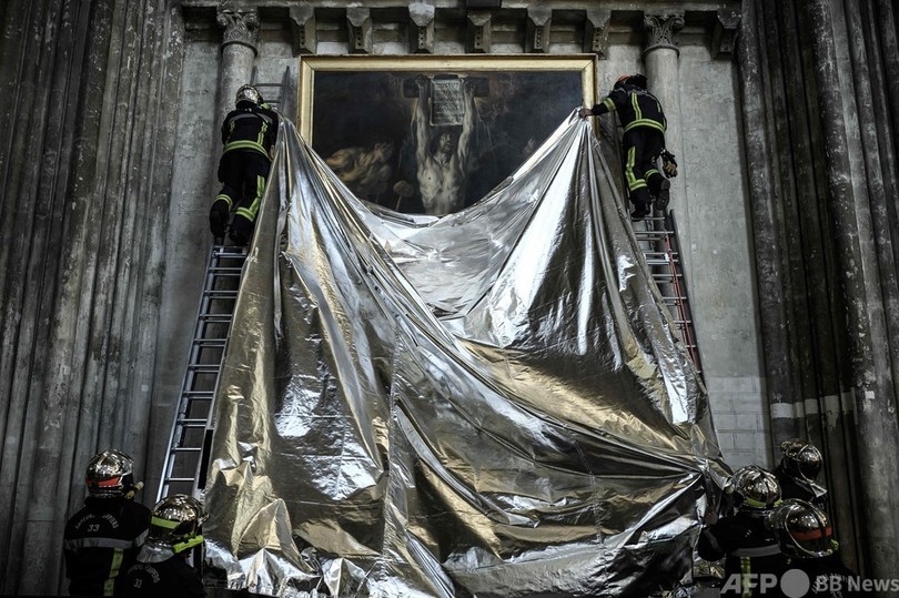 【10月22日 AFP】フランス南西部ボルドー(Bordeaux)のサンアンドレ(Saint-Andre)大聖堂で展示されている芸術作品の保全を目的とした訓練が行われ、絵画を耐火シートで覆う消防隊員ら。(c)AFP