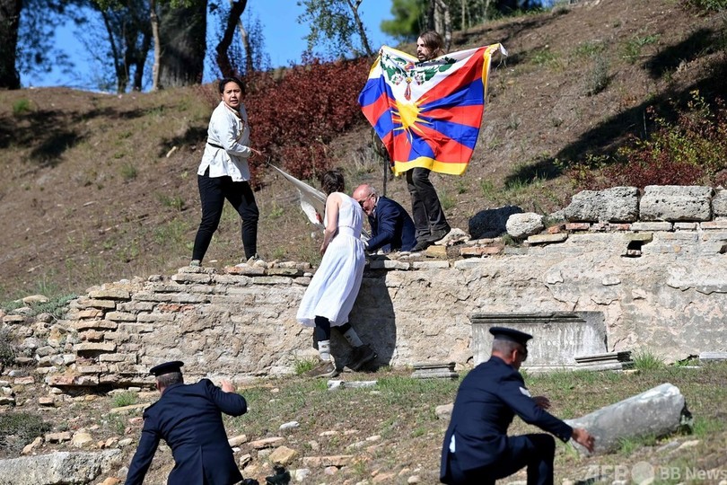 式の後にはデモ隊が会場に入り、中国チベット自治区(Tibet Autonomous Region)の旗と「ノー・ジェノサイド(集団殺害)」と書かれた横断幕を掲げる一幕もあった。デモ隊は警備隊に制止され、拘束された。