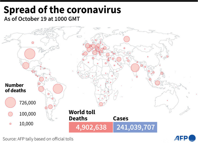 【10月19日 AFP】AFPが各国当局の発表に基づき日本時間19日午後7時にまとめた統計によると、世界の新型コロナウイルスによる死者数は490万2638人に増加した。