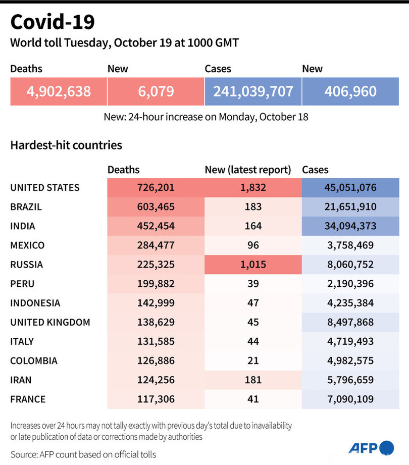 【10月19日 AFP】AFPが各国当局の発表に基づき日本時間19日午後7時にまとめた統計によると、世界の新型コロナウイルスによる死者数は490万2638人に増加した。