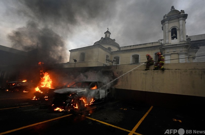 【10月20日 AFP】グアテマラの退役軍人が19日、1960年から1996年まで続いた内戦時の補償金の支払いを求め、議会裏手の駐車場になだれ込み、車に火を付けた。