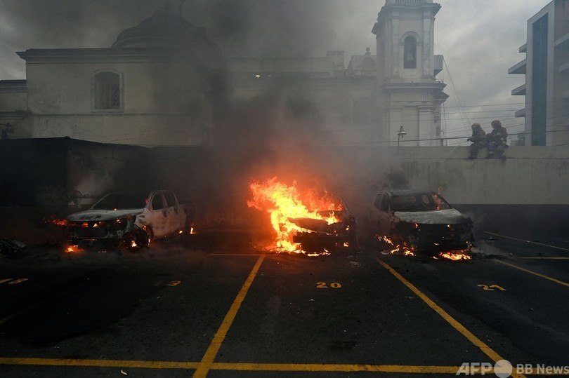 【10月20日 AFP】グアテマラの退役軍人が19日、1960年から1996年まで続いた内戦時の補償金の支払いを求め、議会裏手の駐車場になだれ込み、車に火を付けた。