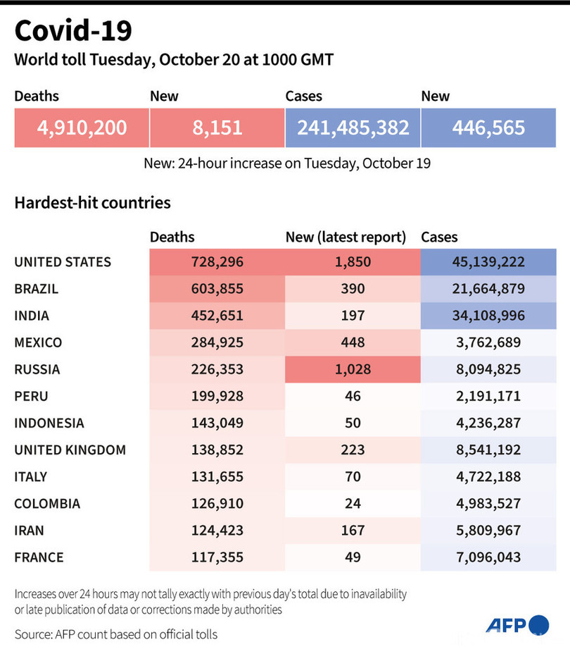 【10月20日 AFP】AFPが各国当局の発表に基づき日本時間20日午後7時にまとめた統計によると、世界の新型コロナウイルスによる死者数は491万200人に増加した。
