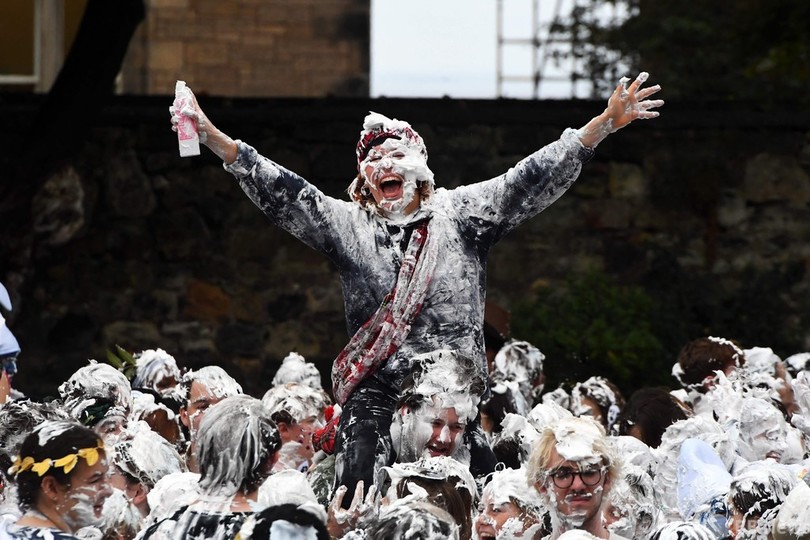 【10月25日 AFP】英スコットランドのセントアンドルーズ大学(University of St Andrews)で新入生歓迎イベント「レーズン・マンデー(Raisin Monday)」が行われ、思い思いの面白い服装をした新入生らが大量のシェービングフォームを体中に塗りつけ合った。このイベントは、毎年1週間にわたって行われる新入生オリエンテーションのハイライトとなっている。(c)AFP