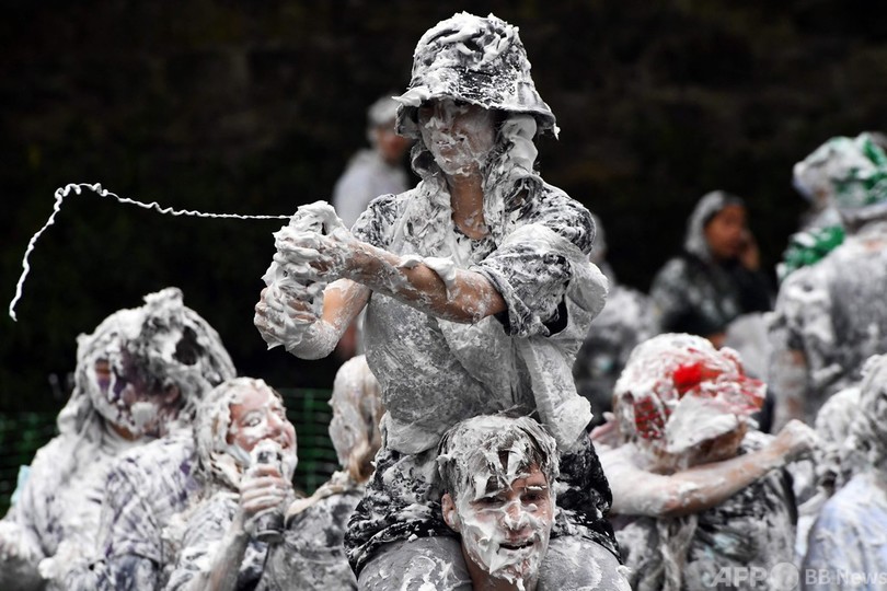【10月25日 AFP】英スコットランドのセントアンドルーズ大学(University of St Andrews)で新入生歓迎イベント「レーズン・マンデー(Raisin Monday)」が行われ、思い思いの面白い服装をした新入生らが大量のシェービングフォームを体中に塗りつけ合った。このイベントは、毎年1週間にわたって行われる新入生オリエンテーションのハイライトとなっている。(c)AFP