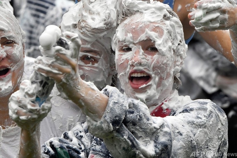 【10月25日 AFP】英スコットランドのセントアンドルーズ大学(University of St Andrews)で新入生歓迎イベント「レーズン・マンデー(Raisin Monday)」が行われ、思い思いの面白い服装をした新入生らが大量のシェービングフォームを体中に塗りつけ合った。このイベントは、毎年1週間にわたって行われる新入生オリエンテーションのハイライトとなっている。(c)AFP