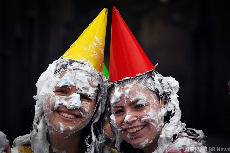 【10月25日 AFP】英スコットランドのセントアンドルーズ大学(University of St Andrews)で新入生歓迎イベント「レーズン・マンデー(Raisin Monday)」が行われ、思い思いの面白い服装をした新入生らが大量のシェービングフォームを体中に塗りつけ合った。このイベントは、毎年1週間にわたって行われる新入生オリエンテーションのハイライトとなっている。(c)AFP