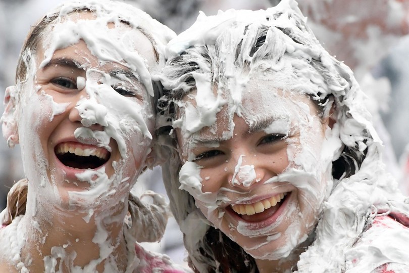 【10月25日 AFP】英スコットランドのセントアンドルーズ大学(University of St Andrews)で新入生歓迎イベント「レーズン・マンデー(Raisin Monday)」が行われ、思い思いの面白い服装をした新入生らが大量のシェービングフォームを体中に塗りつけ合った。このイベントは、毎年1週間にわたって行われる新入生オリエンテーションのハイライトとなっている。(c)AFP