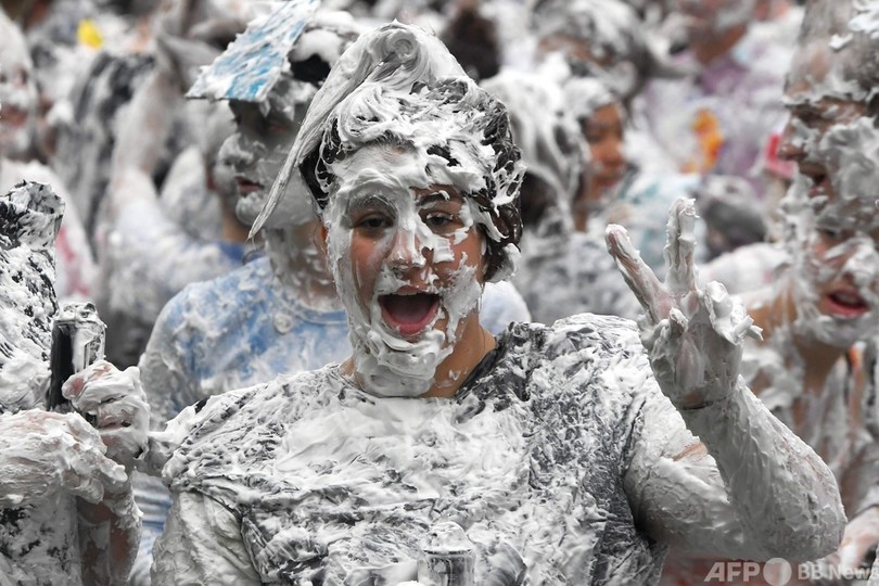 【10月25日 AFP】英スコットランドのセントアンドルーズ大学(University of St Andrews)で新入生歓迎イベント「レーズン・マンデー(Raisin Monday)」が行われ、思い思いの面白い服装をした新入生らが大量のシェービングフォームを体中に塗りつけ合った。このイベントは、毎年1週間にわたって行われる新入生オリエンテーションのハイライトとなっている。(c)AFP