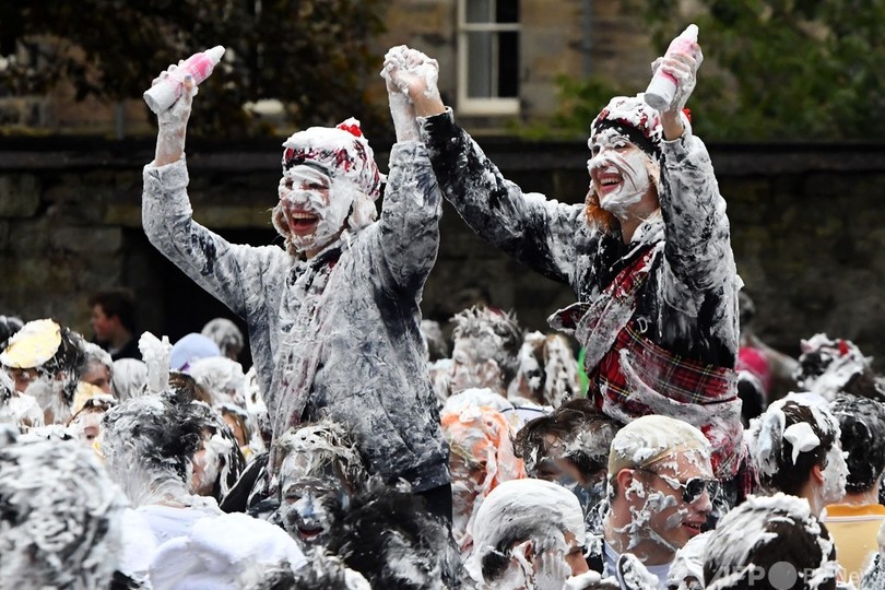 【10月25日 AFP】英スコットランドのセントアンドルーズ大学(University of St Andrews)で新入生歓迎イベント「レーズン・マンデー(Raisin Monday)」が行われ、思い思いの面白い服装をした新入生らが大量のシェービングフォームを体中に塗りつけ合った。このイベントは、毎年1週間にわたって行われる新入生オリエンテーションのハイライトとなっている。(c)AFP