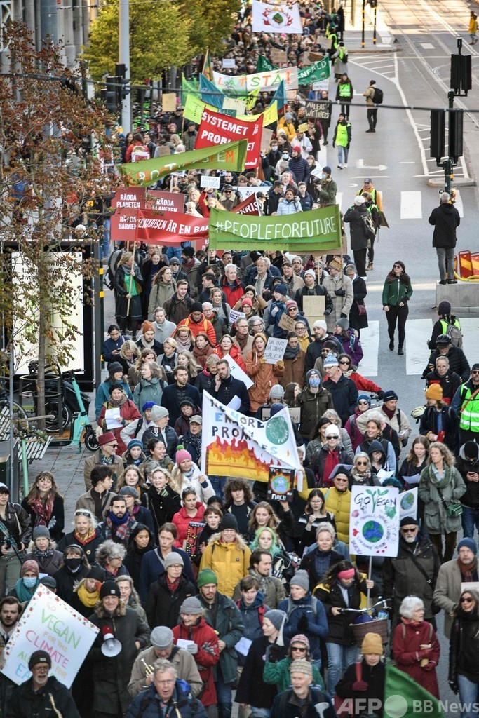 【10月23日 AFP】スウェーデンの首都ストックホルムで22日、気候変動対策を求める運動「フライデーズ・フォー・フューチャー(Fridays For Future、未来のための金曜日)」のデモが行われ、同国の環境活動家グレタ・トゥンベリ(Greta Thunberg)さんも参加した。(c)AFP