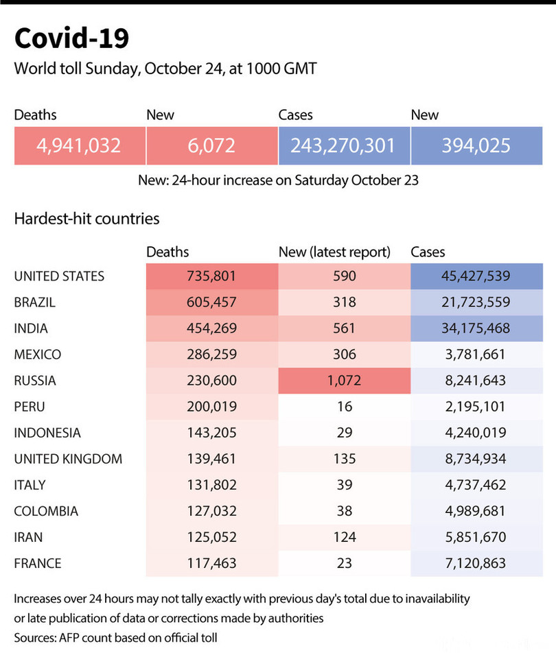 【10月24日 AFP】AFPが各国当局の発表に基づき日本時間24日午後7時にまとめた統計によると、世界の新型コロナウイルスによる死者数は494万1032人に増加した。