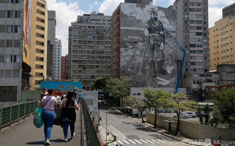 【10月31日 AFP】ブラジルの最大都市サンパウロ(Sao Paulo)でこのほど、「ムンダノ(Mundano)」の名前で活動しているストリートアーティスト(36)が気候変動への関心を高めるために巨大な壁画を公開した。材料は、火災に見舞われたアマゾン(Amazon)の熱帯雨林などから集めた灰だ。