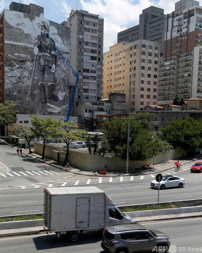 【10月31日 AFP】ブラジルの最大都市サンパウロ(Sao Paulo)でこのほど、「ムンダノ(Mundano)」の名前で活動しているストリートアーティスト(36)が気候変動への関心を高めるために巨大な壁画を公開した。材料は、火災に見舞われたアマゾン(Amazon)の熱帯雨林などから集めた灰だ。