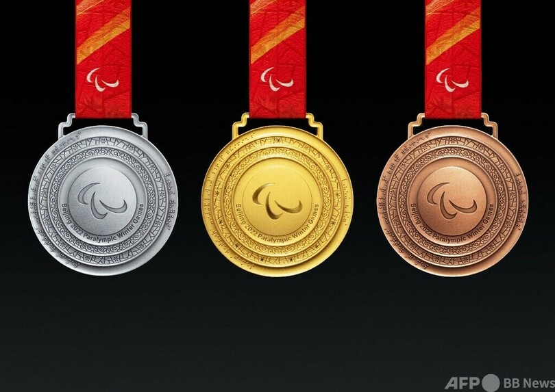 北京2022年冬季パラリンピックのメダルは正面の中心に国際パラリンピック委員会のマーク、その周りに北京2022年冬季パラリンピックの英語「Beijing 2022 Paralympic Winter Games」という文字および金、銀、銅の点字が刻まれています。裏面の中心に北京冬季パラリンピックのエンブレム、その周りに北京2022年冬季パラリンピックの中国語「北京2022年冬残奥会」という文字、また円には13の点と弧が刻まれています。最も外側の円には各種目の名称が彫刻されています。メダルのリボンと箱は冬季オリンピックと同様のデザインや材料となっています。(c)CGTN Japanese/AFPBB News