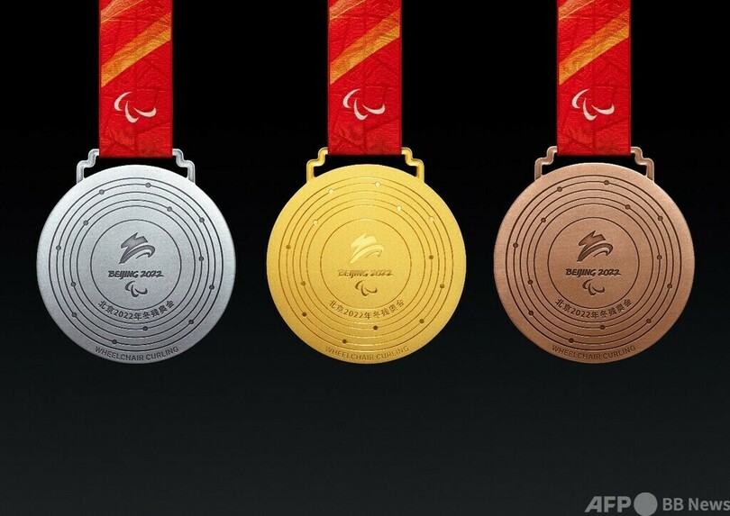 北京2022年冬季パラリンピックのメダルは正面の中心に国際パラリンピック委員会のマーク、その周りに北京2022年冬季パラリンピックの英語「Beijing 2022 Paralympic Winter Games」という文字および金、銀、銅の点字が刻まれています。裏面の中心に北京冬季パラリンピックのエンブレム、その周りに北京2022年冬季パラリンピックの中国語「北京2022年冬残奥会」という文字、また円には13の点と弧が刻まれています。最も外側の円には各種目の名称が彫刻されています。メダルのリボンと箱は冬季オリンピックと同様のデザインや材料となっています。(c)CGTN Japanese/AFPBB News