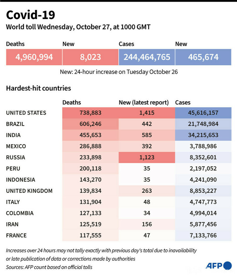 【10月27日 AFP】AFPが各国当局の発表に基づき日本時間27日午後7時にまとめた統計によると、世界の新型コロナウイルスによる死者数は496万994人に増加した。